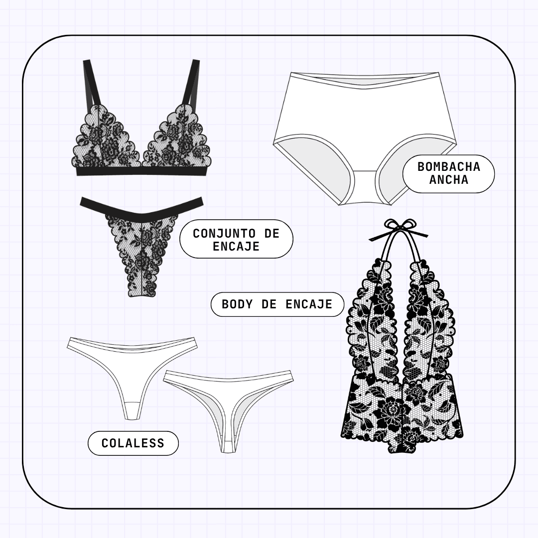 Con estos patrones podrás fabricar: Bralette con tira de escote, bralette halter, vedetina, culotte de encaje, colaless, tanga regulable/ajustable, conjunto de encaje, bombacha tiro alto, bralette estilo top y body de encaje.