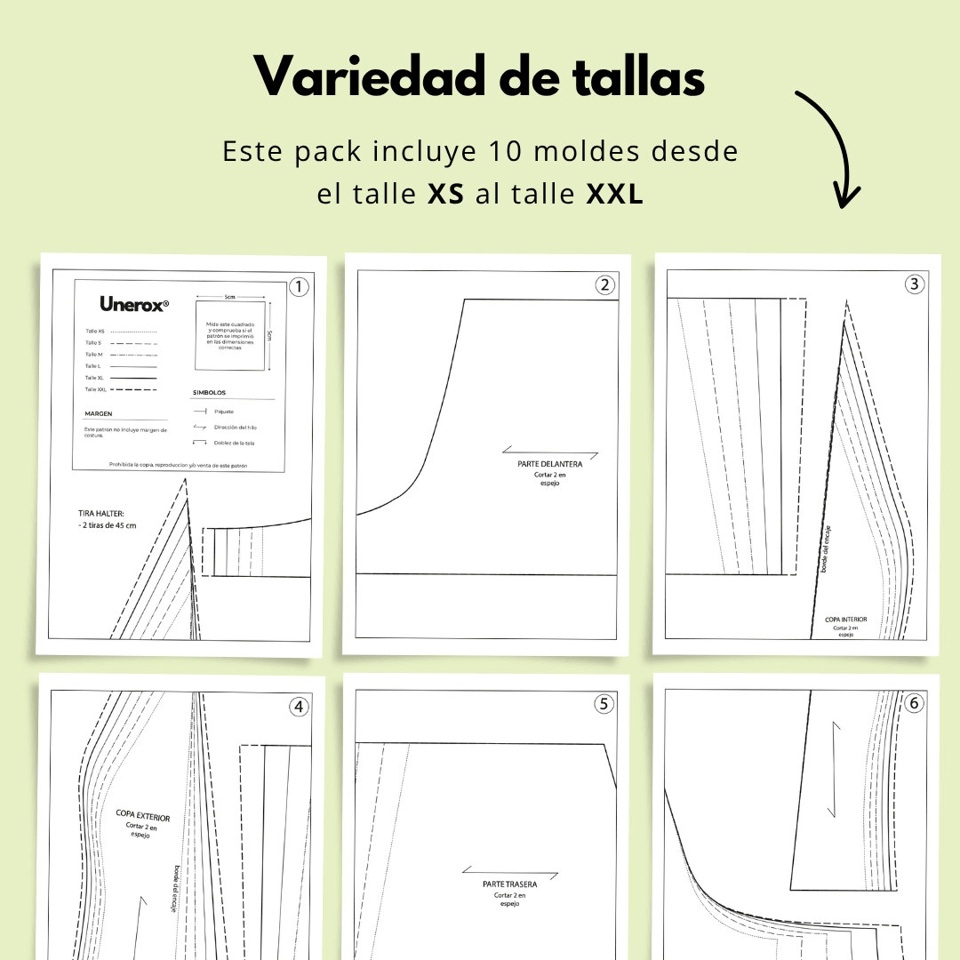 – 10 Patrones imprimibles en tamaño real, en hojas A4, cada uno desde el talle XS a XXL,